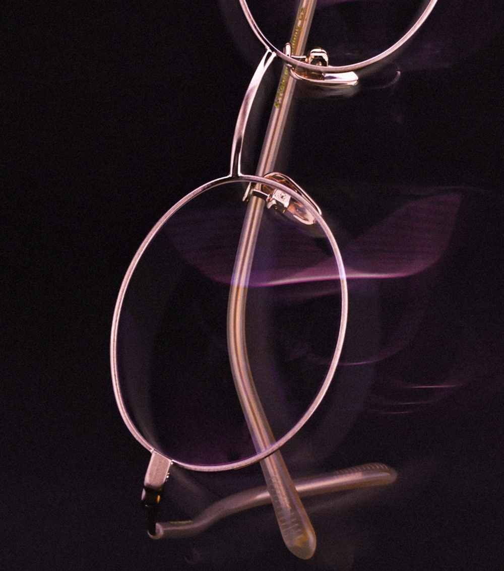 這是一款長橢圓形鈦金屬眼鏡,鏡框尺寸極小且結構堅固,兼具輕盈與耐用感。