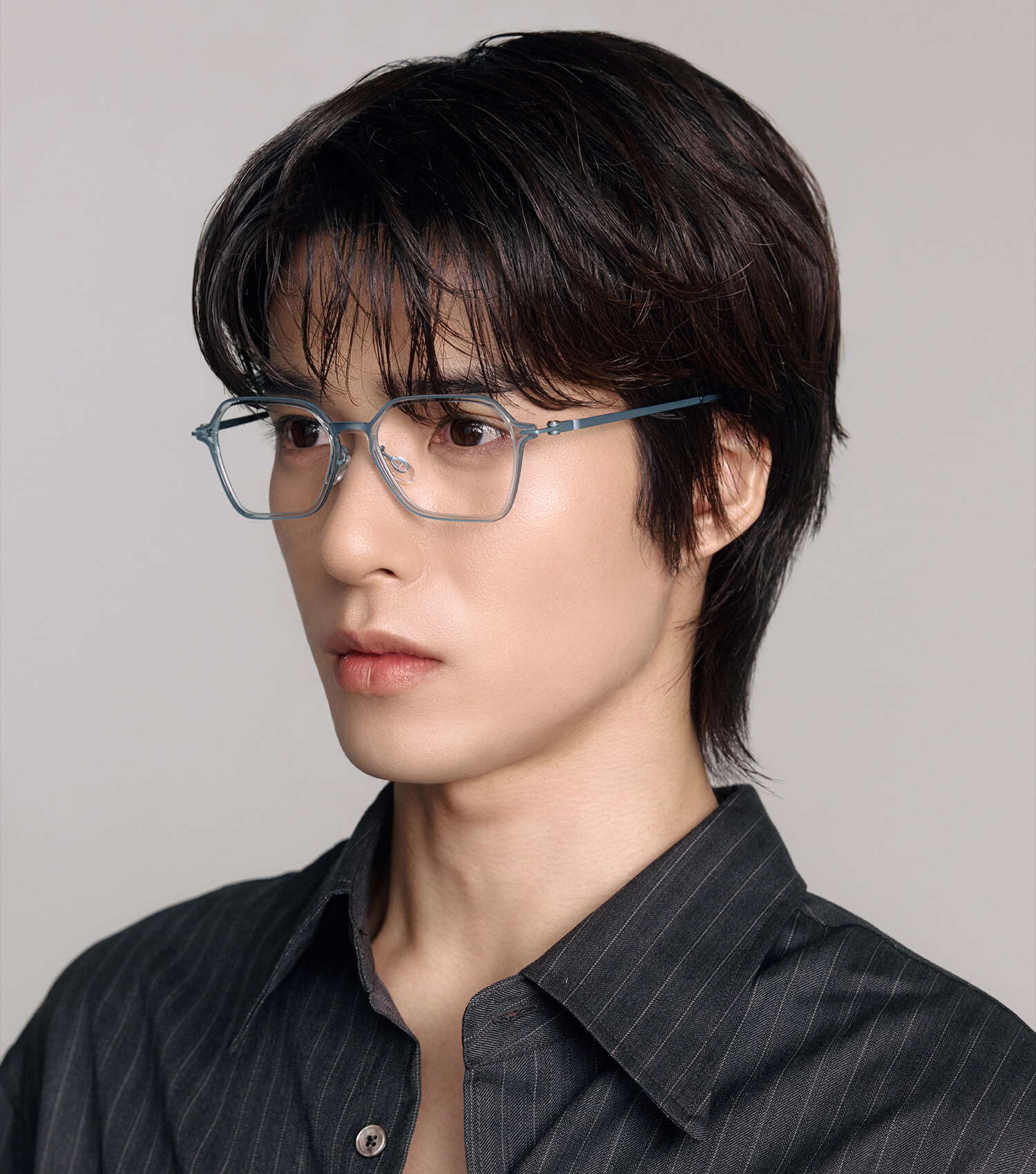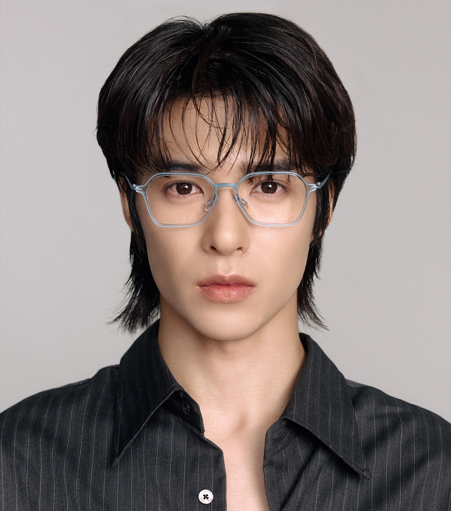 採用 輕透藍色板材Acetate 搭配同色金屬鏡腿的組合,呈現乾淨、冷調、精品感。